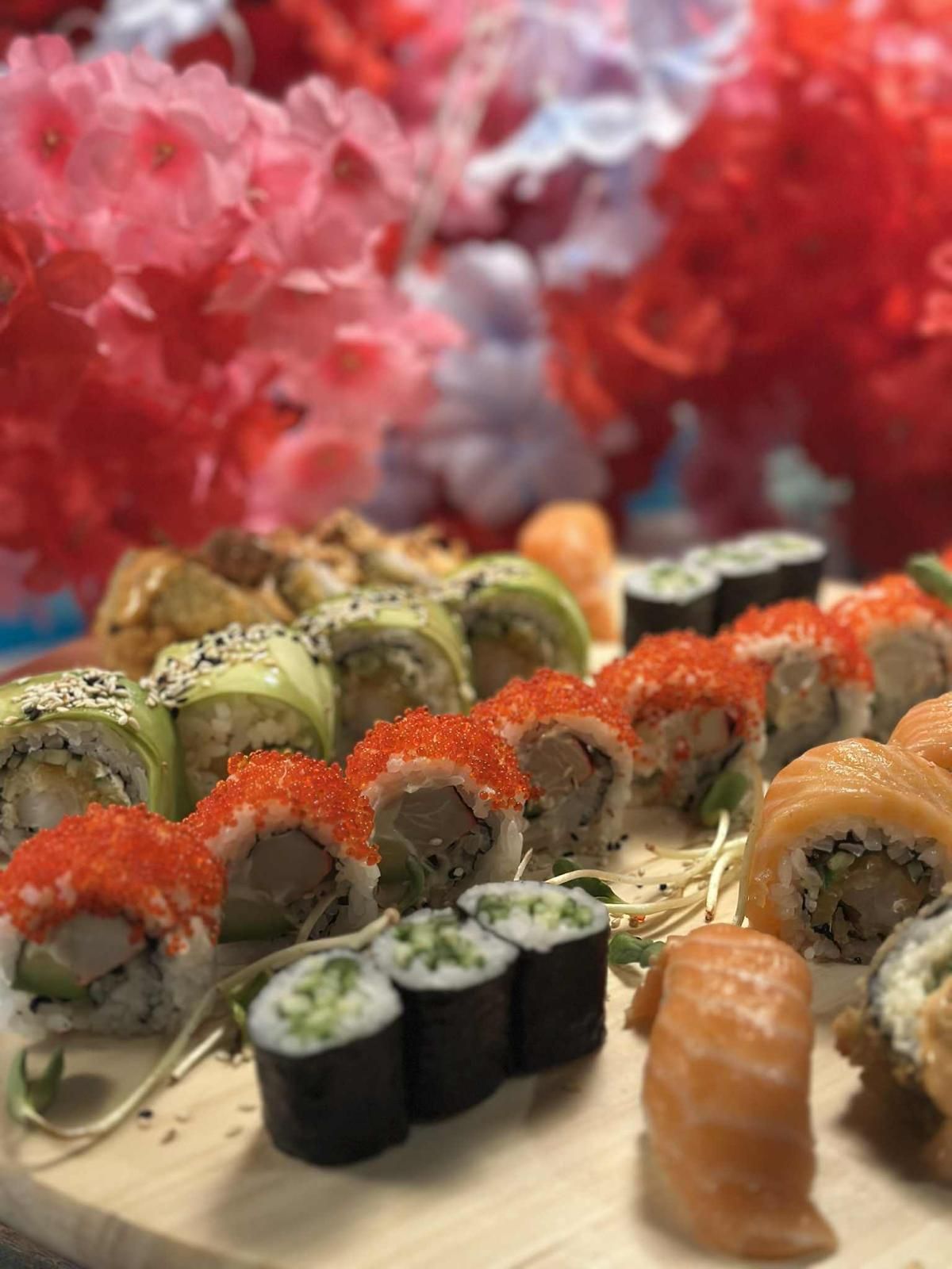 - 8szt. uramaki z łososiem w tempurze i panko, serkiem philadelphia, ogórkiem, oshinko, kanpyo, na wierzchu z awokado, serkiem philadelphia, pomarańczą